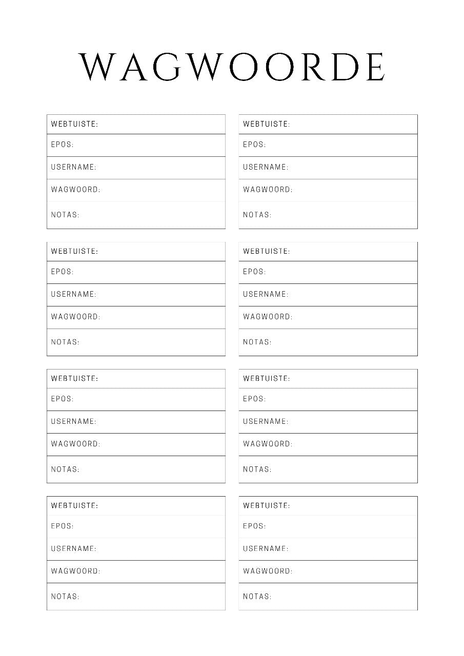 Size A5, available in Afrikaans and English, hard front and back cover, twist binding, quarterly sections (tabs).
